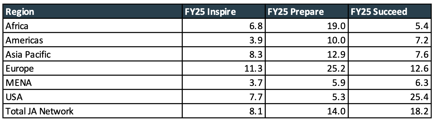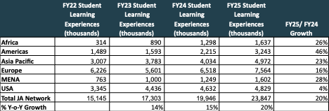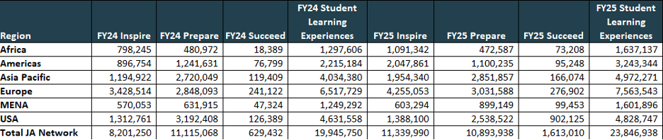 According to JADE (JA Data Experience) data, the JA network delivered 23.8 million student learning experiences in FY25, up from 19.9 million in FY24—an increase of 20 percent. This growth was visible across all six regions of the network and reflects the collective efforts of colleagues, volunteers, teachers, and partners around the world.