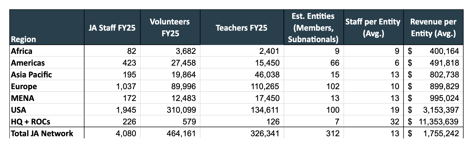 Because data metrics are reported by JA members and regional operating Centers using different fiscal-year and school-year timelines—and then aggregated globally—it is most accurate to interpret these figures as multi-year trend data. Some JA members, for example, have fiscal years ending in June or December, while others follow different reporting calendars. In addition, some members collect data from subnational offices, which can introduce delays in aggregation. However, because the methodology for collecting the data remains consistent year over year, the resulting trend data remains highly useful for understanding the direction and strength of the network as a whole.