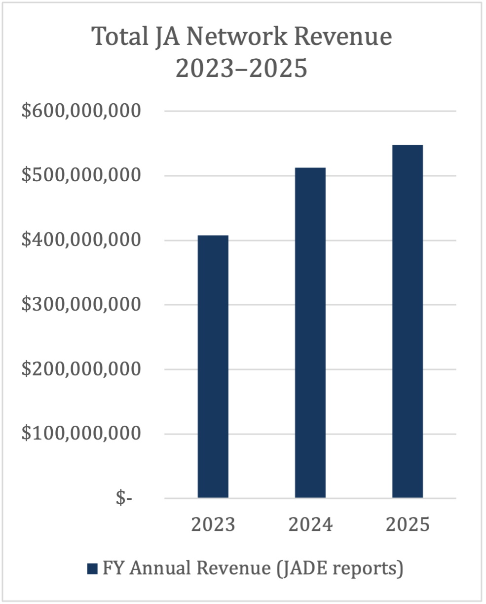 The progress is also reflected in the financial strength of the network. Total revenue collected by the JA network increased substantially in FY25, reaching approximately $547 million, the highest level in JA’s history. This continues the growth trajectory of the past several years, with revenue rising from just over $400 million in FY23 to $547 million in FY25.